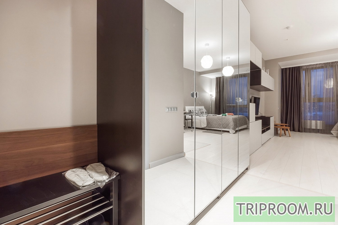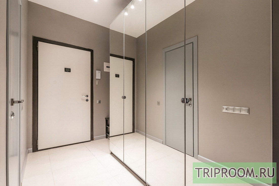 Зеркальные вместительные шкафы при входе создадут необходимую легкость.