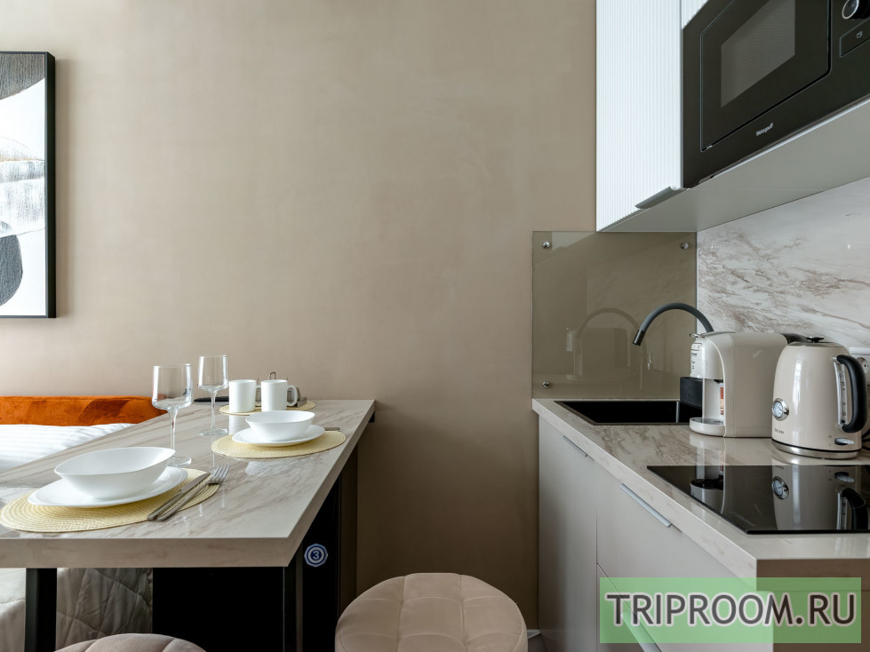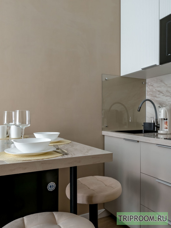 • Полностью оборудованная кухня: варочная панель, СВЧ, чайник, мини-холодильник, посуда, столовые приборы.
