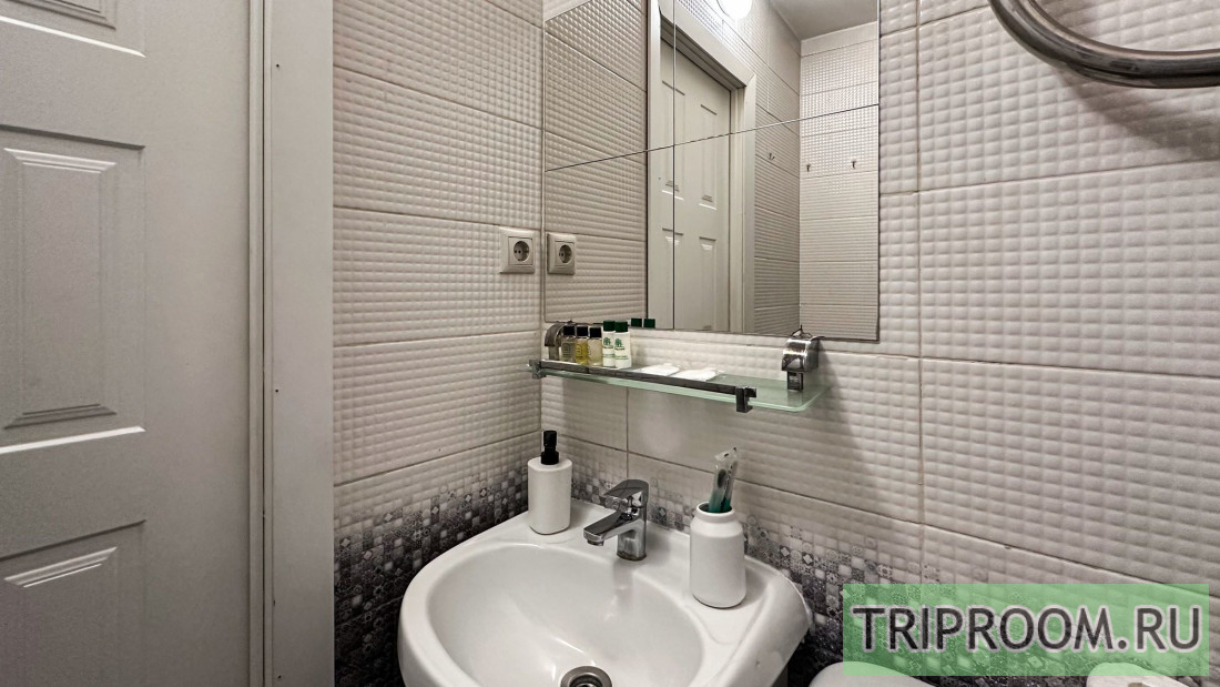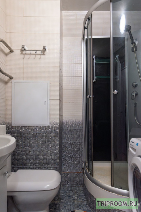 — современный санузел с душевой кабиной, стиральной машиной и косметическими наборами Flat Inn.
