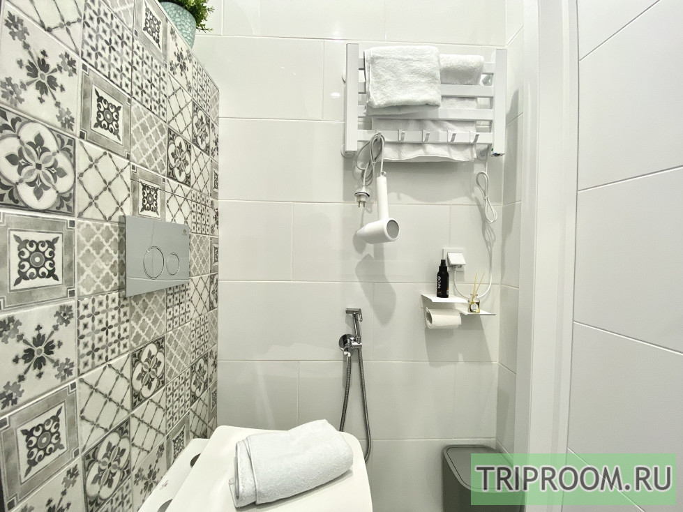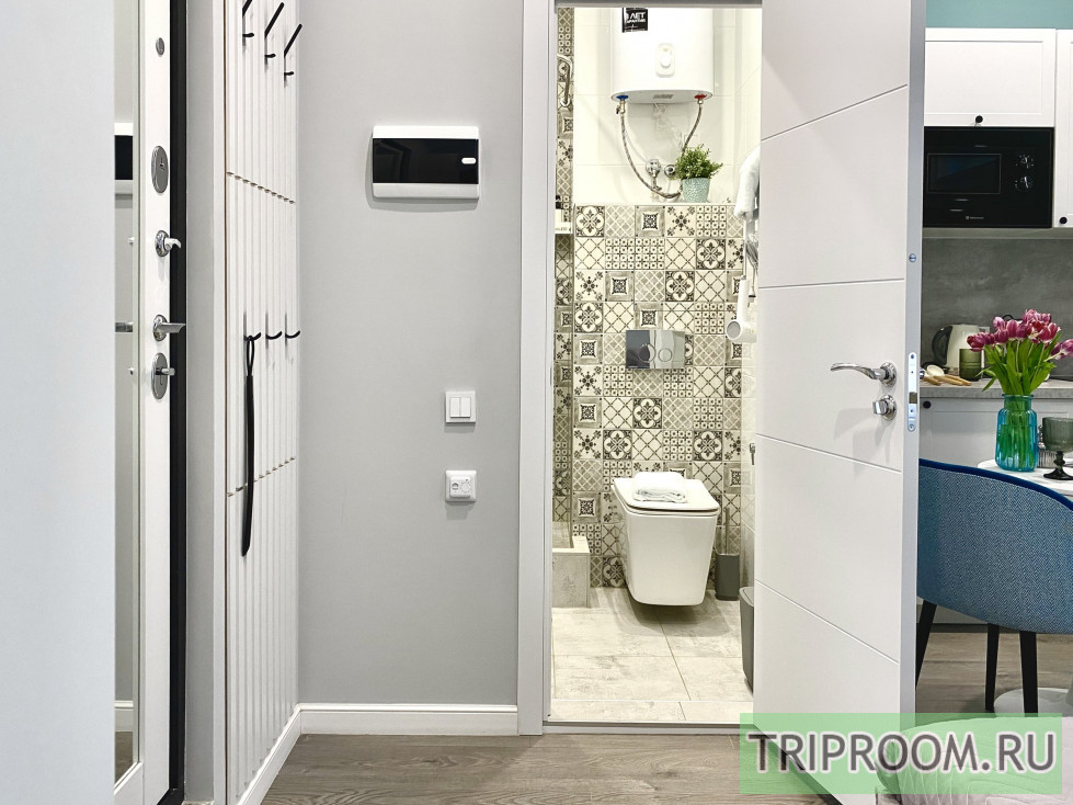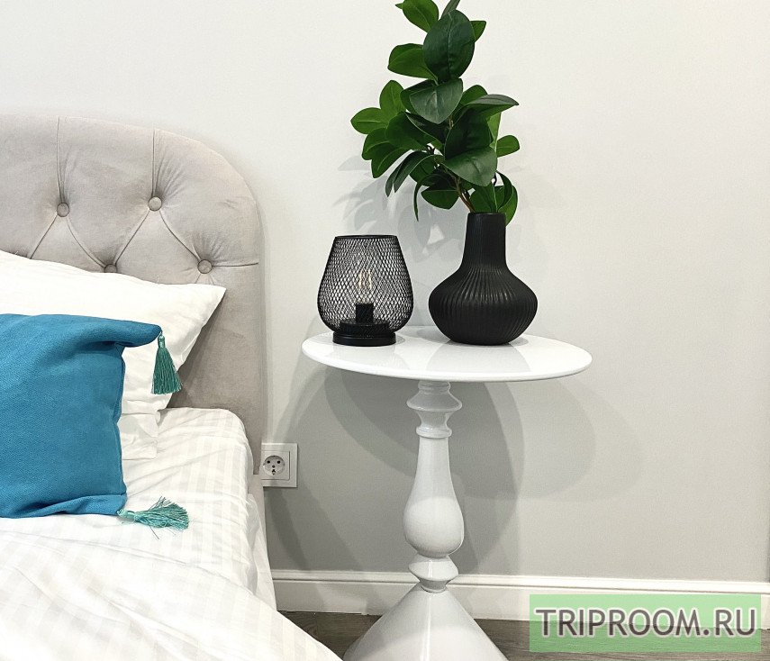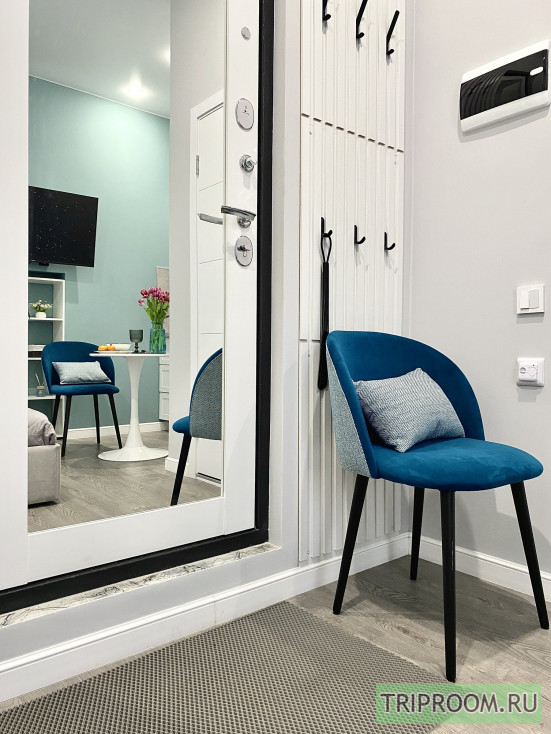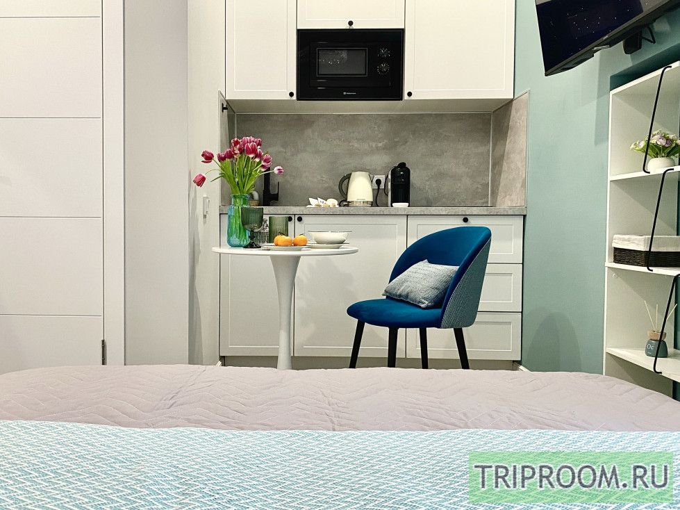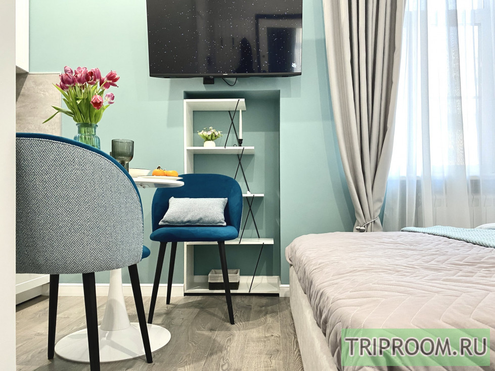 Квартира площадью 16 м² оформлена в современном дизайнерском стиле с продуманной планировкой. В спальной зоне — удобная двуспальная кровать с качественным матрасом, мягким текстилем и аккуратным декором. Интерьер выполнен в светлых оттенках с акцентами, создающими уютную и спокойную атмосферу.