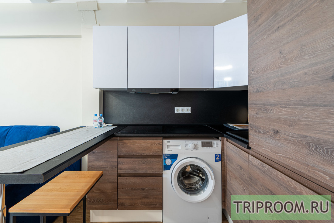 Интерьер выполнен в спокойных тонах с функциональной планировкой. В жилой зоне установлен удобный раскладной диван и телевизор. Кухонная часть оборудована варочной панелью, вытяжкой, холодильником и стиральной машиной, есть необходимая посуда и базовое оснащение для приготовления еды. Санузел совмещённый, с ванной и душевой системой.